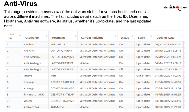 The Antivirus Monitoring page provides IT administrators with real-time insights into the antivirus protection status of multiple systems within an organization. By tracking antivirus installations, update status, and operational states, organizations can ensure endpoint security, compliance, and proactive threat prevention.