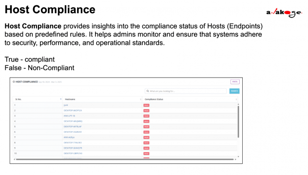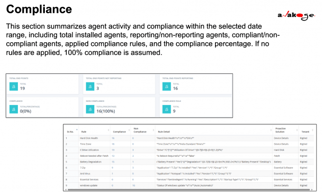 Compliance monitoring ensures that all endpoint devices within an organization adhere to security, operational, and policy-based standards. It helps IT administrators track whether devices follow predefined rules, such as having essential software installed, meeting security requirements, and maintaining proper system configurations. If no compliance rules are applied, devices are assumed to be 100% compliant by default.