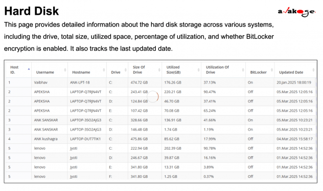 The Hard Disk Details section provides a comprehensive view of hard disk usage across different monitored devices. The following data is captured: