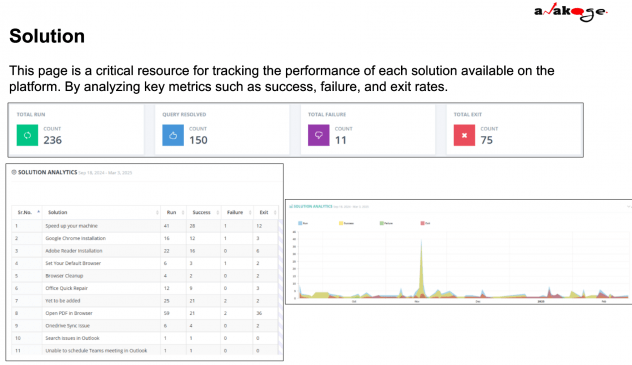 The Solution Page is a key resource for tracking solution performance on the platform. It provides insights into success, failure, and exit rates, helping measure effectiveness and optimize user experience.