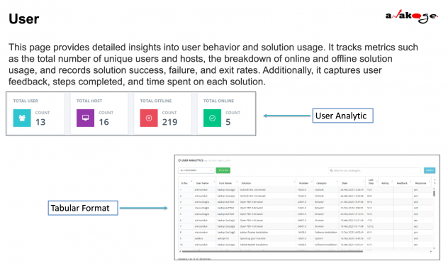 The User Analytics section provides comprehensive insights into user behavior, tracking solution usage patterns, engagement levels, and effectiveness. It captures key metrics such as total users, host devices, online vs. offline usage, solution success rates, user feedback, and time spent per session.