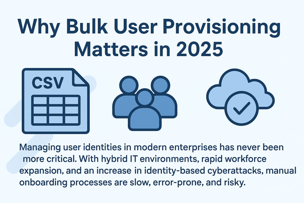 Delays in provisioning can lead to orphaned accounts, privilege creep, or compliance gaps, increasing both security and operational risk. Automating user provisioning using bulk operation templates allows IT teams to onboard employees efficiently while maintaining strict compliance and audit readiness.