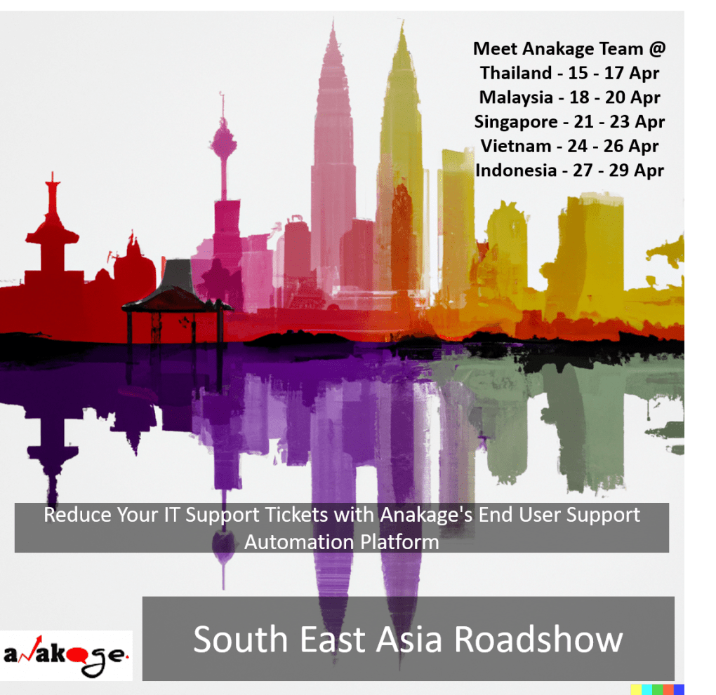 Exciting news! Our sales team is hitting the road and visiting key cities in Southeast Asia from April 14th to April 30th, including Thailand, Malaysia, Singapore, Vietnam, and Indonesia. We’re thrilled to meet with prospective clients and share how our Anakage End User Support Automation platform can help manage those endless device and application support tickets for IT Service desk teams.